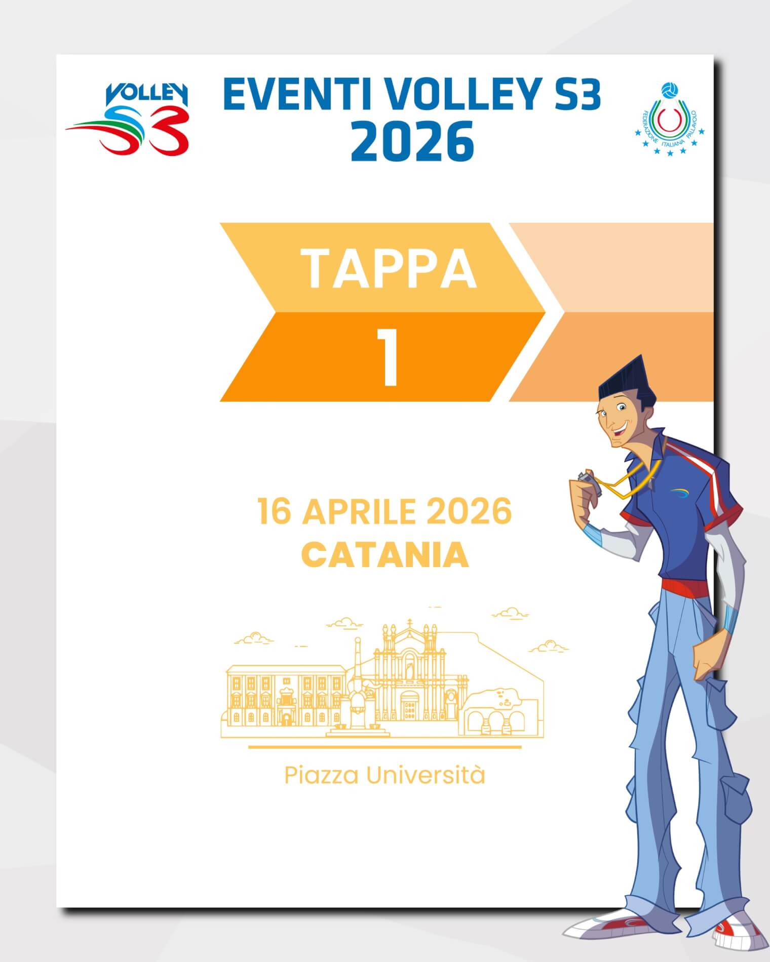 Le spettabili società sono invitate a partecipare all’evento in oggetto che si terrà a Catania il prossimo 16 aprile in piazza Università e che vedrà la presenza di Andrea Lucchetta e Valerio Vermiglio insieme al loro staff, che guideranno i partecipanti, ETA’ MAX 10 ANNI, lungo un percorso che prevede varie attività (vedi allegato).